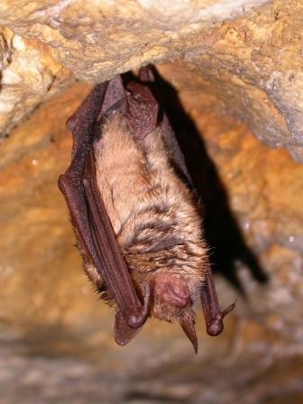 Le Murin à oreilles échancrées : sa taille (5cm) et la couleur ocre de son pelage ventral laineux permettent de l’identifier (photo : P. Jourde)